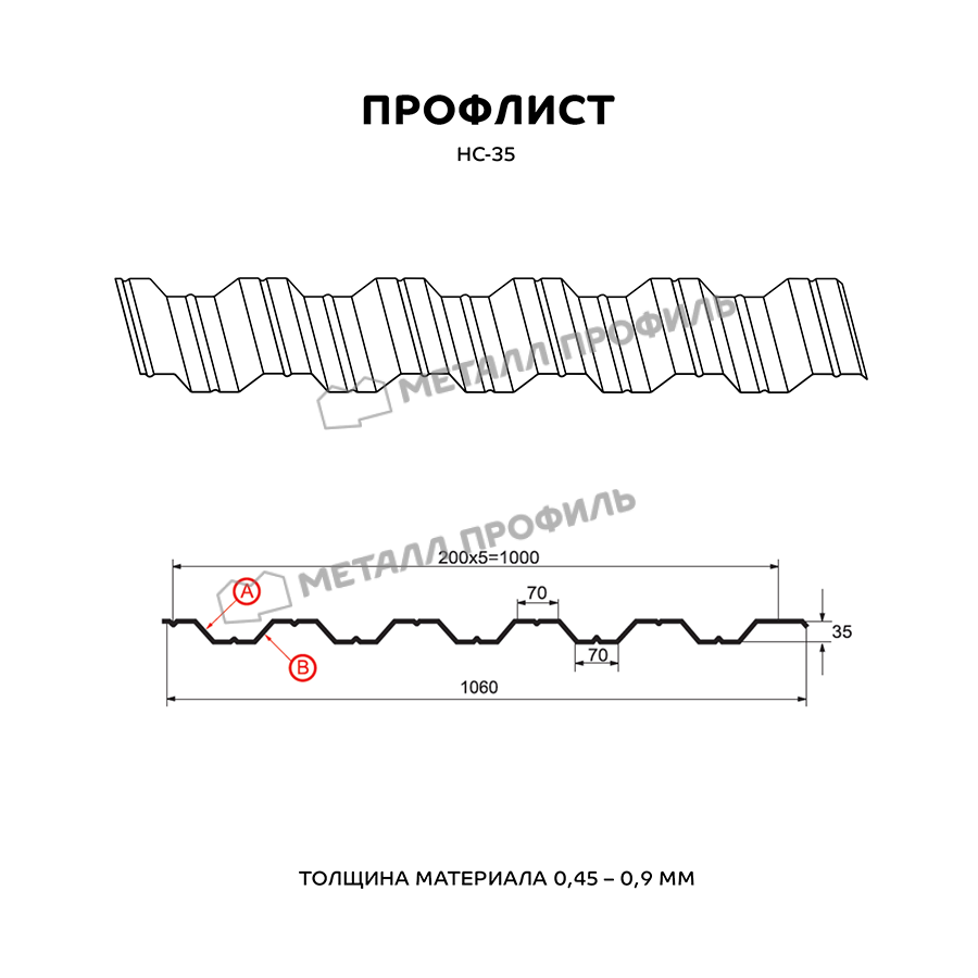 Многофункциональный и выгодный материал с одинаковым с обеих сторон профилем. Маркировка НС говорит о том, что профлист является и «несущим», и «стеновым». Он пользуется популярностью как для гражданского строительства, так и для индустриальных объектов. С помощью профилированного листа с глубиной волны в 35 мм получаются конструкции очень разного назначения: каркасные здания ( склады, цеха, торговые центры ), обустройство кровли, ограждения частных и общественных территорий, быстровозводимые постройки ( павильоны, навесы ). Отличную способность выдерживать нагрузки НС-35 придают дополнительные рёбра жёсткости, которые расположены с обеих сторон профлиста. Полезная ширина материала достигает 1000 мм при полной ширине 1060 мм, то есть при установке данного профиля в боковое соединение уйдёт 60 мм. Толщина стали имеет диапазон от 0,5 до 0,9 мм – это влияет не только на механическую стойкость профнастила, но и его тяжесть. Полимерное покрытие из каталога Компани Металл Профиль добавит материалу дополнительную неуязвимость к ржавению и солнечному излучению.